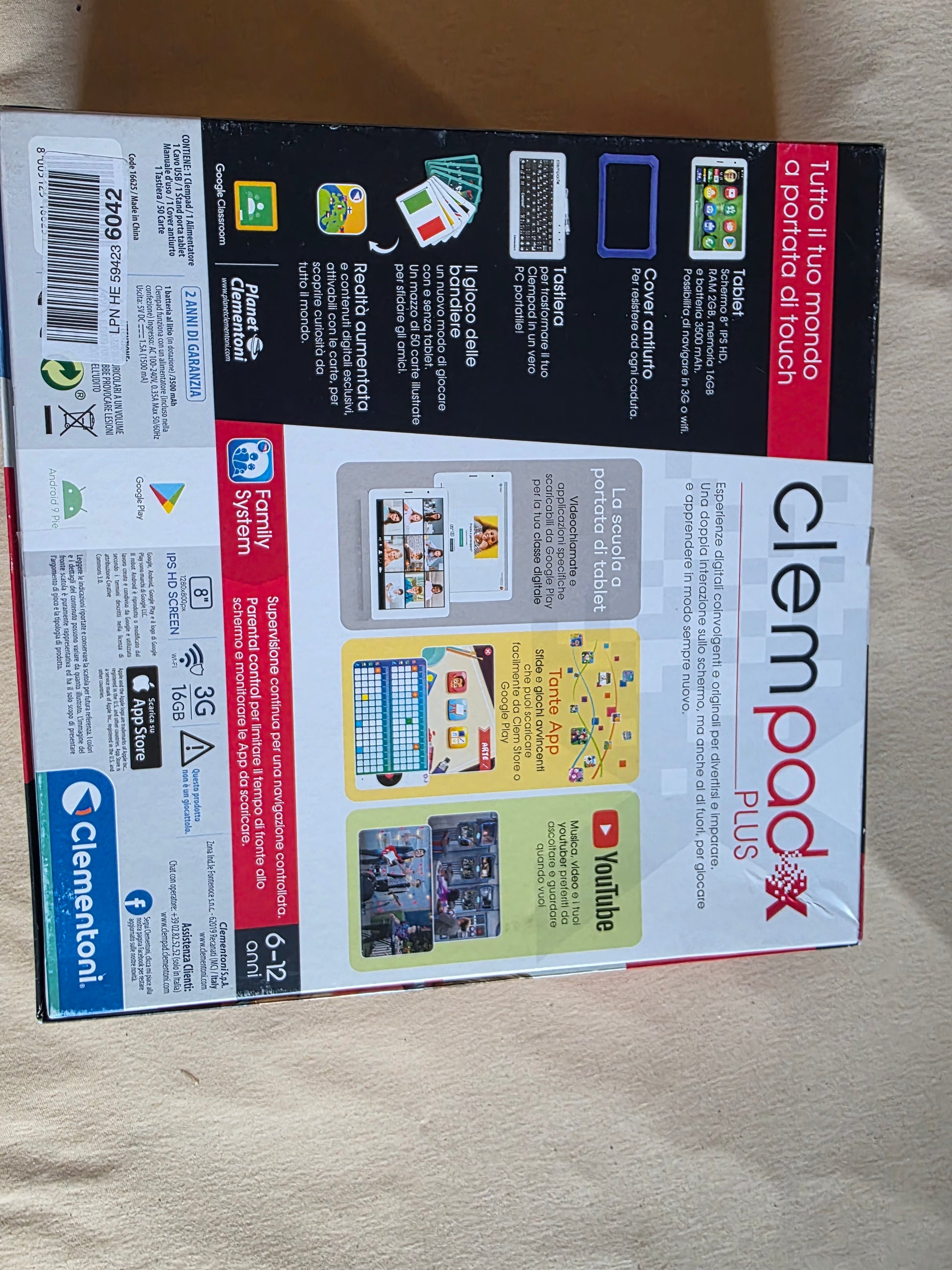 Ein Tablet für Kinder. Verpackung auf Italienisch, Gerät kann aber auf sämtliche Sprachen gestellt werden.